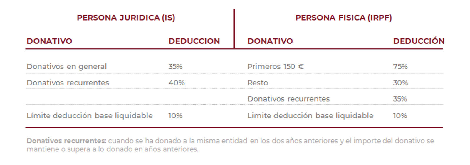 Las donaciones no son gastos deducibles (letra e) del artículo 15 de la Ley del Impuesto) pero dan derecho a una deducción en la cuota íntegra del 35% de la donación, pudiendo elevarse esta deducción al 40% si en los dos años anteriores se hubieran realizado donaciones en beneficio de la misma entidad. Esta deducción en cuota les proporciona a las donaciones una mejor fiscalidad que si fueran gastos deducibles, de modo que se ha establecido un límite en la base de esta deducción del 10% de la base imponible del ejercicio. Las cantidades que excedan este límite se podrán aplicar en los 10 años siguientes.